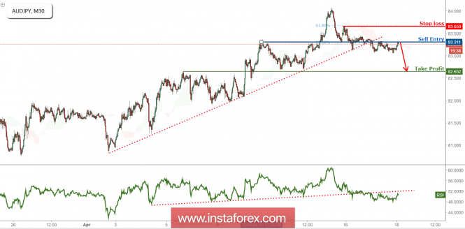 澳元/日元突破其上行支撑位,我们看好在83.311(23.6%斐波那契回撤位,水平重叠阻力位)卖出。 我们预计价格将一路下滑至82.652的支撑位。